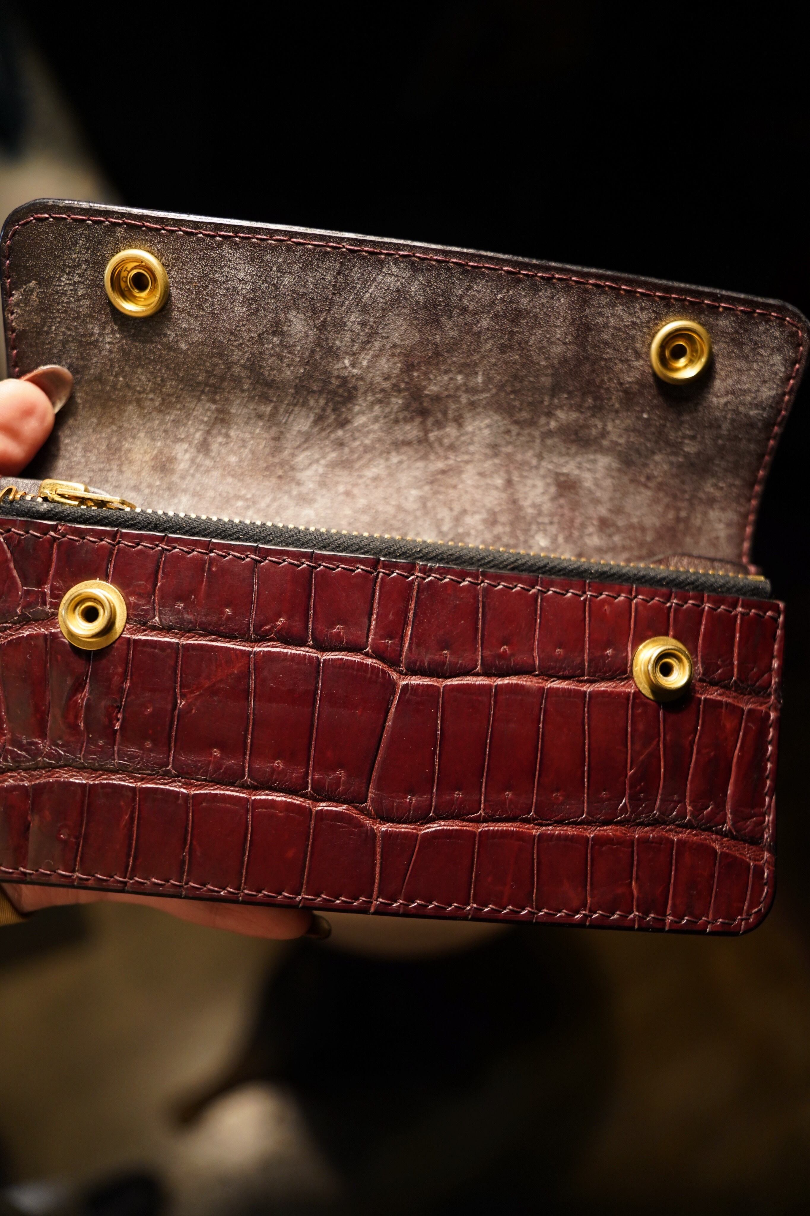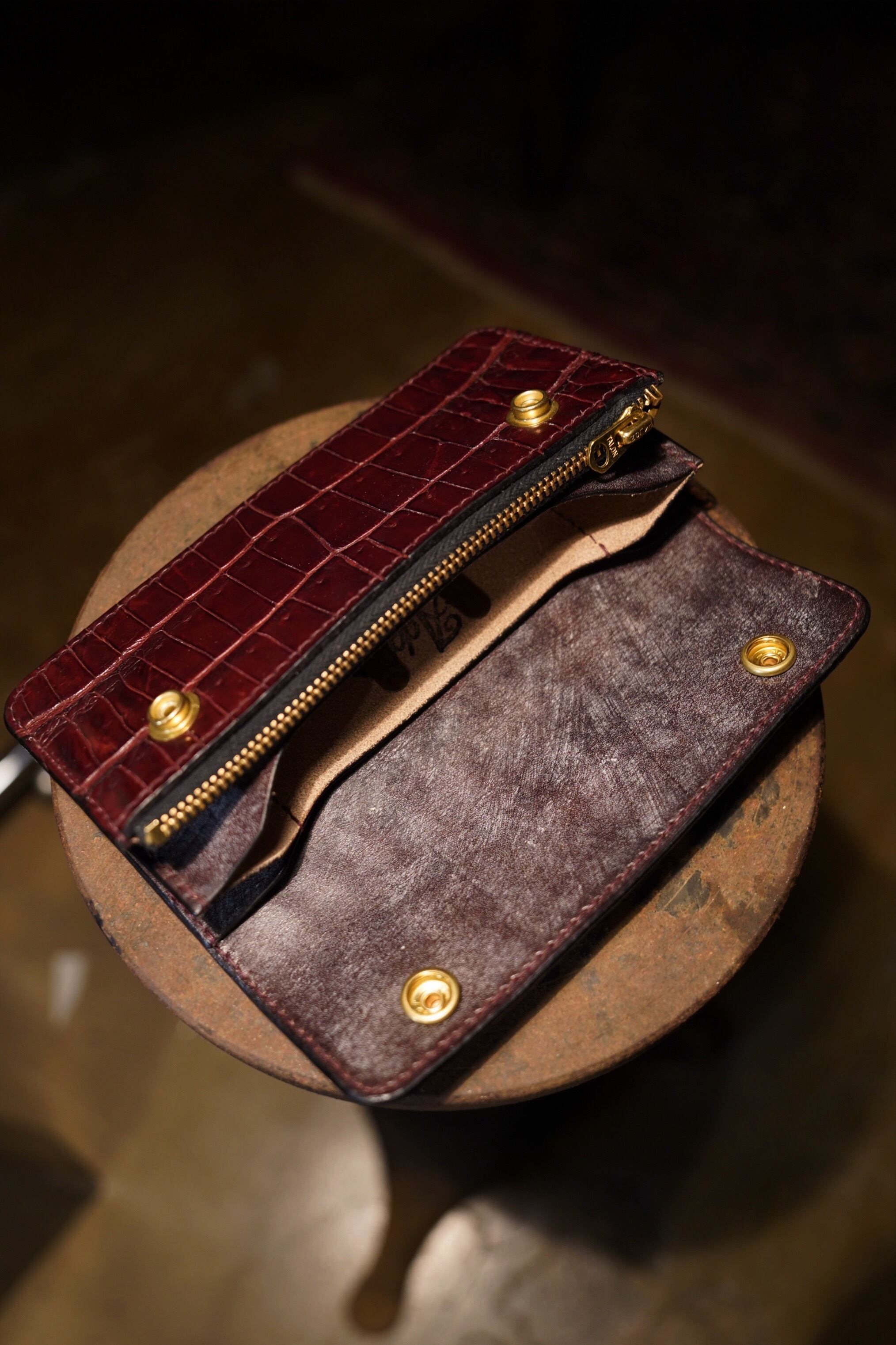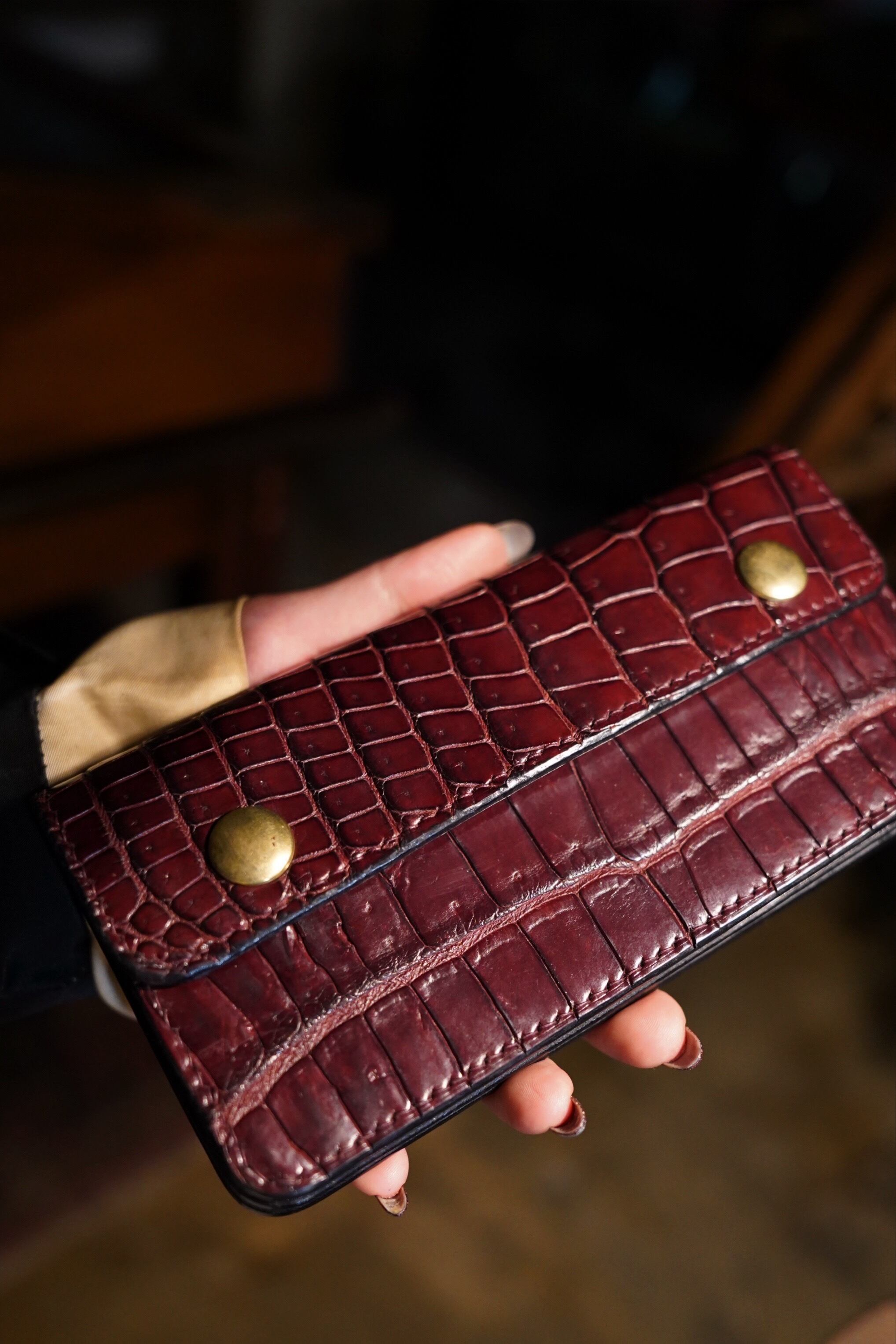 製作過程でつく細かいキズ、シミやヌメ革特有のシワ、トラ、ムラ、キズ等が有る場合がありますが、それも個性、味と捉えていただければと思います。