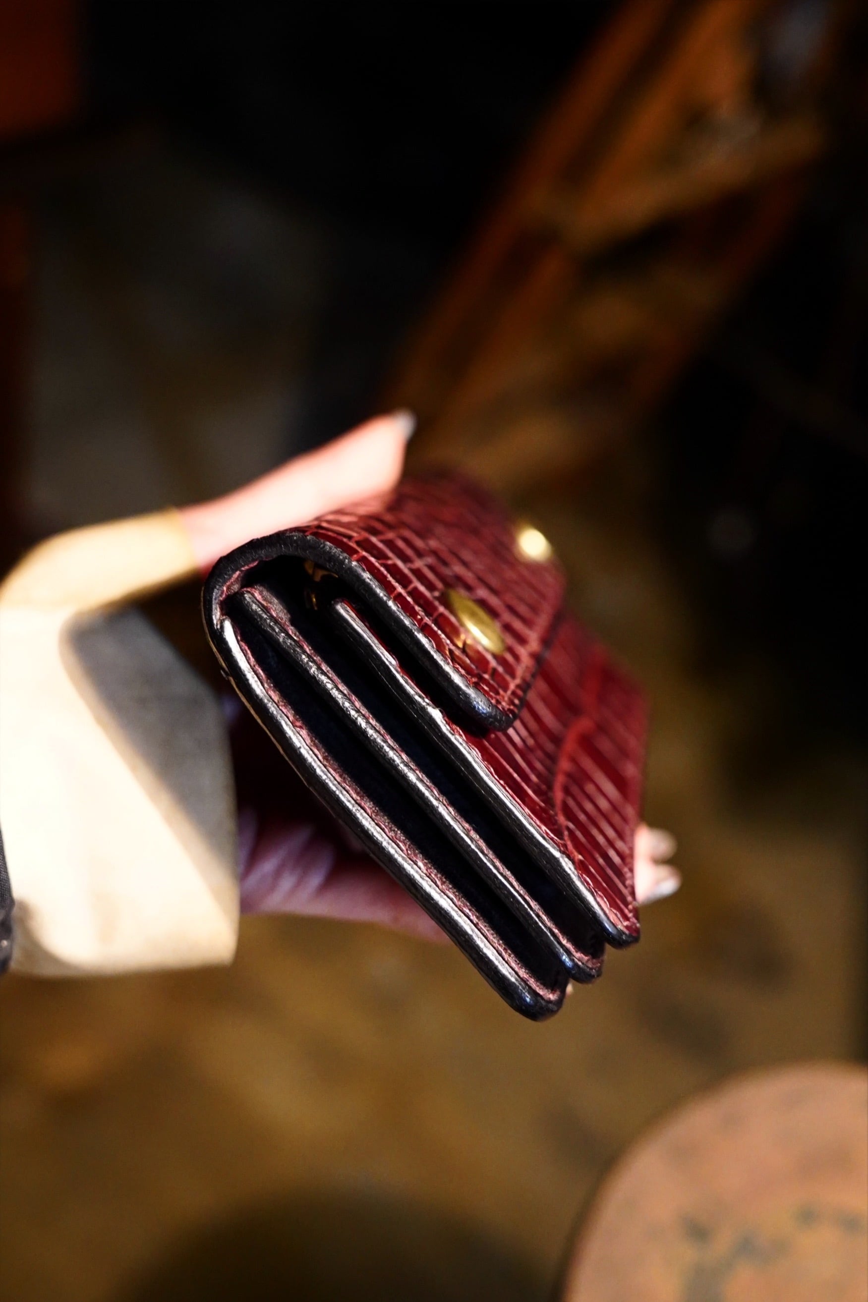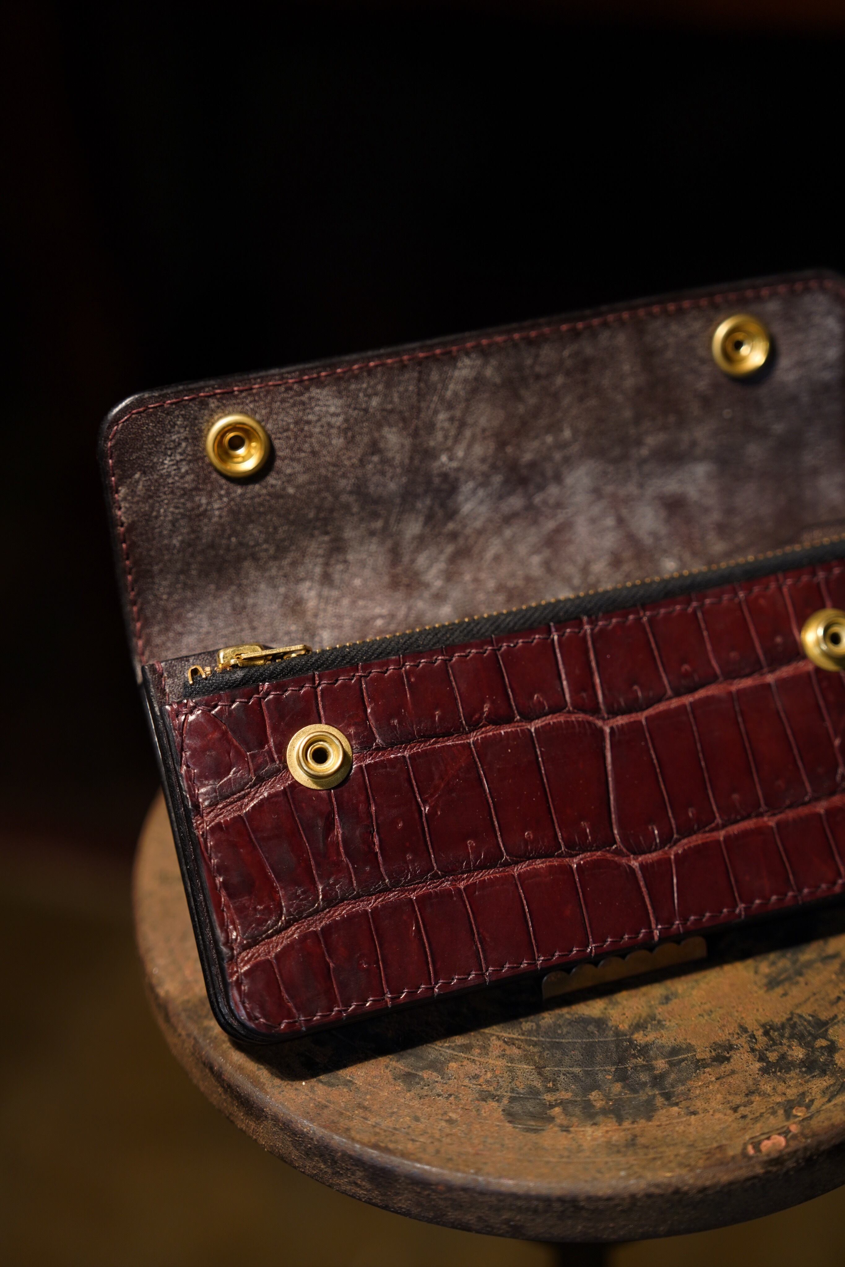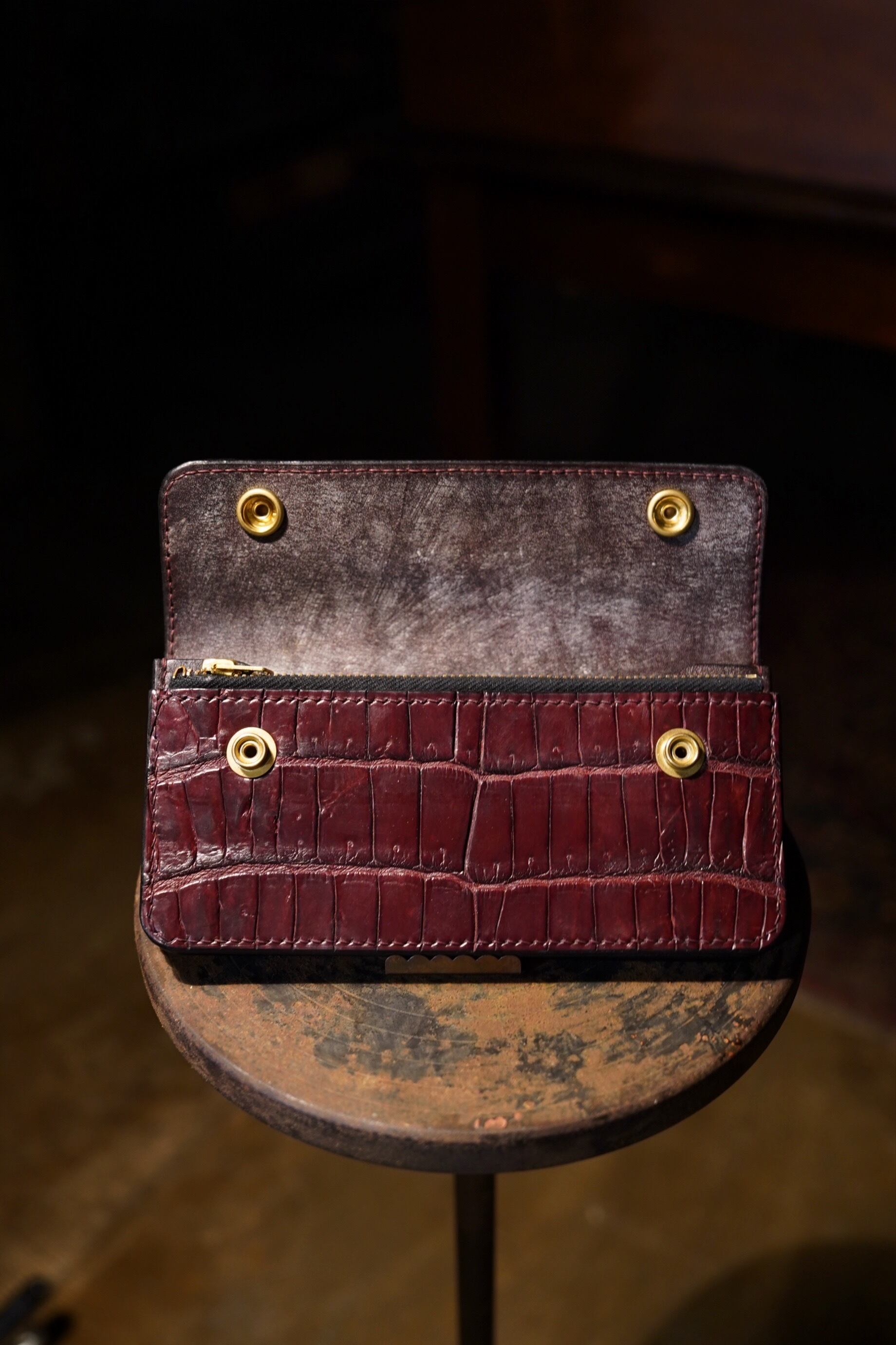 製作過程でつく細かいキズ、シミやヌメ革特有のシワ、トラ、ムラ、キズ等が有る場合がありますが、それも個性、味と捉えていただければと思います。